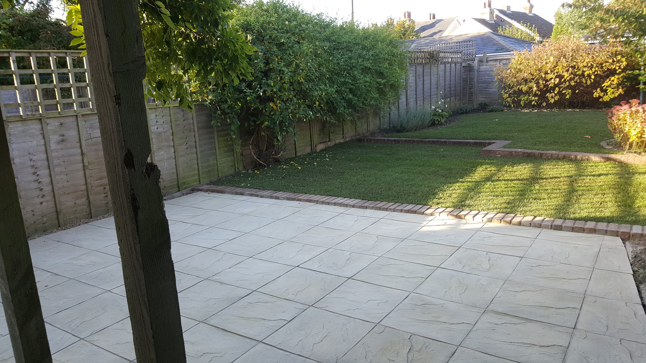 Our client recently finished extending the back of her house and the builders hadn’t left the garden in a very good state. We took up a old patio which they had used to cut bricks on, and a very rotten, dangerous decking area. We then levelled the ground, put in the brick edging and turfed the rear two sections of garden. The patio in the fore ground is laid on and old concrete base for a garage and an unusable bit of ground post extension.